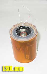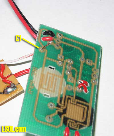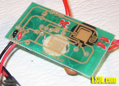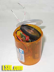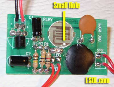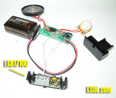 Recording Hold down the record button on the small PC board. The indicator lights. Speak your message or record your sound effect, ( up to 20 seconds) about 1-2 inches from your speaker. Release the record button to stop recording. The indicator turns off. Playback Press the play button located on the large PC board. The recording module plays your recording and the indicator flashes once when playback stops. If the playback slows down you can replace the battery. You will not lose your recorded message when you replace the battery. Your message will be retained until you record a new message. Upgrading the playback button Please note that doing any of the following modifications will void your warranty on your Radio Shack product. Don't ask me why the record button is on a wire and the playback button is not. It would make it a lot easier to use. However, it is not that hard to replace the play button by soldering a couple of wires to the board.  Turn the board over and pull the two tabs that hold the record button in place. You will then be able to remove the metal piece that holds the rubber button. You can put these in a drawer and use them on another project. if not, you can throw them away in a few years when you do not remember what they are for.  There is a hole in the board labeled C1. We are showing you the back side of the board in the picture above so you can see it better. Turn the board to the side with all the components and scrape off the green protective covering around the hole. Insert a wire and solder on the side with the components.  To attach the second wire it is easy to make a small hole in the board as shown. I used a pointed X-acto blade and very carefully made a small hole to place a wire through and solder it in place. When you do this go slow.  Here is a finished look at the two wires that can now be attached to some type of trigger to activate the sound module. You could add a momentary switch that could be pushed from a panel. You could also attach a motion switch and record some animal sounds. Placed in a box car and you could have sounds come from the car as it rumbles down the track. Here is an example of how to use a LGB 17100 switch to activate the sound module.  Just attached the two wires to the LGB switch. Then when your rolling stock that has a magnet rolls over the switch it will activate the Radio Shack sound module. The speaker on the unit is used to record the sound as well as playback the recorded sound. You can get better and louder sound by creating a small cabinet to place the speaker in once you have recorded the sound on your module.  One idea that we used was to use a larger pill bottle. As most of us in Large Scale are older we should have no problem in finding a usable bottle. Most lids have an inner lid inside the turn-able removable cap. Pull this out from the lid and cut a hole the size of the speaker. You can also make a small hole in the lid to let the playback wires exit the bottle. Just drop the whole unit inside the bottle and place the lid on top. The speaker has a plastic cover so should be somewhat protected. This will not make a waterproof container for direct outside use, but will keep the unit safer when it is placed inside a building or rolling stock. The container will also give the speaker a richer and louder sound. You can seal the edge with tape so it will be easy to replace the battery when needed. Have fun with your new toy and let me know how you ended up using yours. Top of Page