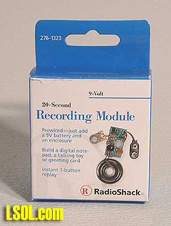 Using pre-wired Electronics I am not real big on making my own electronics. When I was younger my brother and I would ride our bikes down to Radio Shack to pick up parts for a project. We would solder them together and then ride back to get more parts. Why? Because we had burnt up the first set of parts we bought. Now a days you will find less and less electronics parts at Radio Shack, but on the bright side they do have some interesting pre-made electronics that you can use on your railroads. 20-second Recording Module
