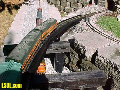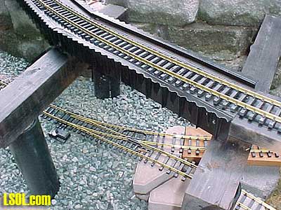Our hobby has a tendency to become very expensive. I look for ways to reduce any of the costs without sacrificing realism. My railroad empire is located in our side and back yards. The main line runs from one raised flower bed to under a staging area under our deck. This area spans a distance of thirty five feet. Building a girder truss deck bridge spanning a gap of thirty five feet was going to be very costly. I have found a few bridges in the local hobby shops, on the internet, or several G-Scale magazines. All of these bridges are beautiful and very realistic, and all would deplete my families' checking account. So in order to bridge this gap, I needed to find a low cost way to build this bridge. I thought about building a trestle but in my corner of the world, the bridge would have needed to be made of Cedar or Redwood. Knowing that this type of bridge requires a large amount of wood, this would be another costly option. I am a member of the Puget Sound Garden Railway Society. I found an article in the club newsletter (July 2005) which described an inexpensive way to build a girder truss deck bridge. I used this idea in my railroad layout. This style of bridge fit right into my era of late steam and early diesel. The bridge on my railroad empire is curved and requires a shallow grade. The radius the arc is ten feet. I used a two by six inch by two foot long section of outdoor treated wood product for the decking. Each section was supported by a four inch diameter black plastic drain pipe. I dug a one foot deep support hole with a posthole digger. We live in an area where ground freezing isn't a problem. I placed a measured section of the drain pipe into the hole and filled the pipe with 5/8ths clean gravel. The gravel adds weight to the post, and provides water drainage. At the top of the pipe it left room for a circle wood plug cut from a scrap two by six. The plug was drilled in the center to receive a foot long section of rebar. The rebar and plug was pounded down into the gravel filled drain pipe. The deck sections of the bridge were screwed into the wooden plug. Now the deck sections are held together by the screws, and the rebar holds the deck sections onto the drain pipes. All of the wood was painted with a black in color paint. The girder truss sections were created from two by six dimensional outdoor lumber and a product called Emerald Edge. I measured the Emerald Edge two and one half inches down from the thickest edge, and cut it horizontality. The piece of edge I kept looked very realistic when compared to the side of the real world girder of a girder truss deck bridge. I screwed the cut edge to the side of the two by six inch outdoor wood. After assembly I painted the bridge with an all purpose black paint. Emerald Edge by Easy Gardener - Product Information  | - Durable 4-ft sections