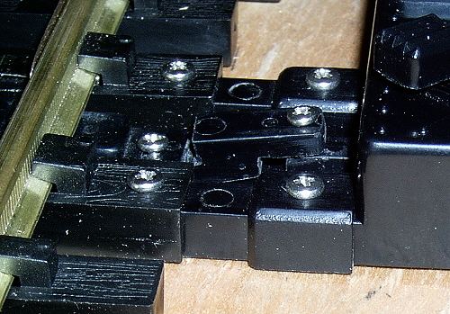 Another thing I have tried is to install two turnout motor assemblies on the same turnout by placing them on opposite sides of the points. Of course you must wire the motor terminals reversed on one of the assemblies so both will work in concert in a push - pull fashion. In my case, I did this to make a more trust worthy aux. switch operation on one of my #6 turnouts - more than for the purpose of providing more force for moving the points - a bonus feature. Top view of an Aristo-Craft turnout motor assembly pair installed in push - pull fashion on a # 6 turnout: