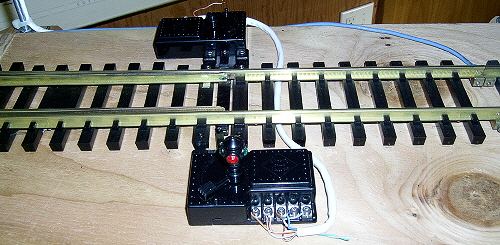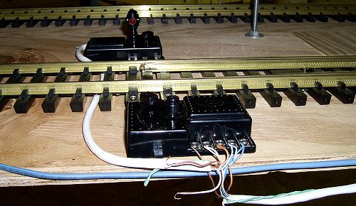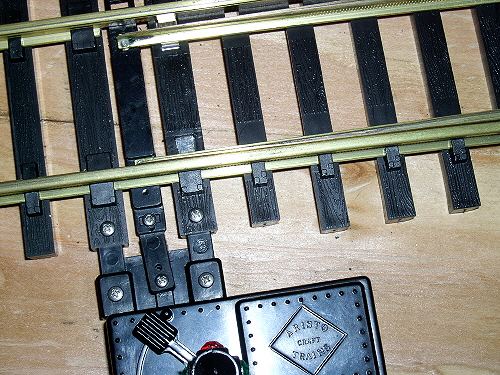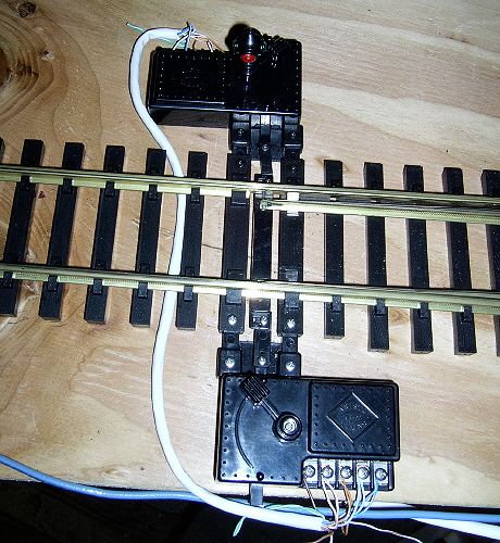 Outside view of an Aristo-Craft turnout motor assembly pair installed in push - pull fashion on a # 6 turnout: