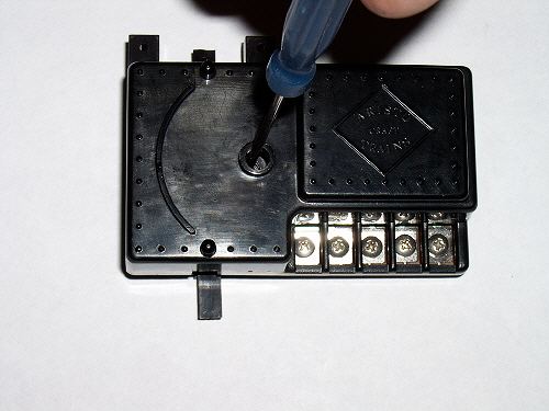 Turnout motor assembly cover installed with small screwdriver through hole to secure gear & spring subassembly from popping out during assembly: