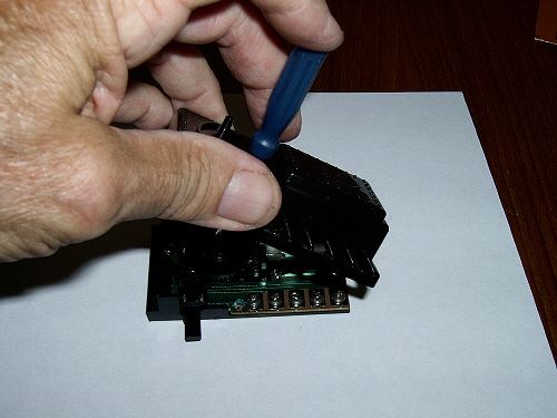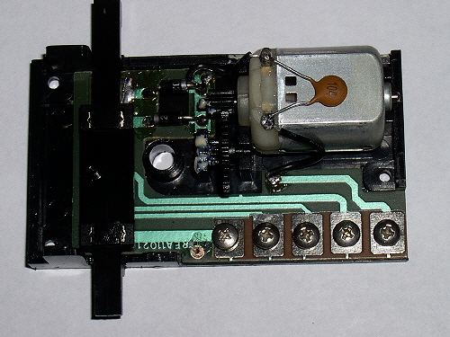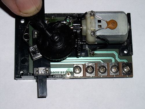 This is the motor assembly with gear & spring subassembly removed, but shows the throw bar in is normal contactor down position against the circuit board pads: