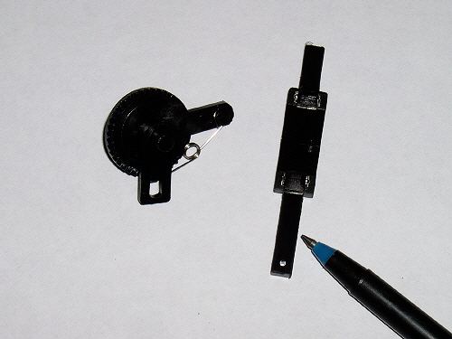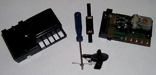 Throw bar shown upside down exposing two spring loaded "U" shaped contactors (There are little coil springs under the metal contactors.) The contactors slide across the circuit board trace pads and serve to electrically bridge selected pad pairs, thereby completing an intended circuit path. One contactor (in concert with a diode) serves as the limit switch for the motor - preventing it from overrunning once the points are thrown whilst at the same time requiring an opposite polarity DC voltage to be applied to activate the motor for throwing the points back in the other direction. The other contactor is the auxiliary SPDT accessory switch (I use this for controlling LED status indicators for turnout directional status.):