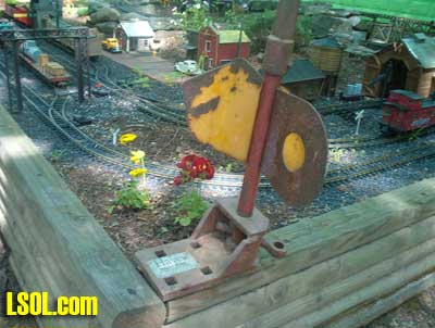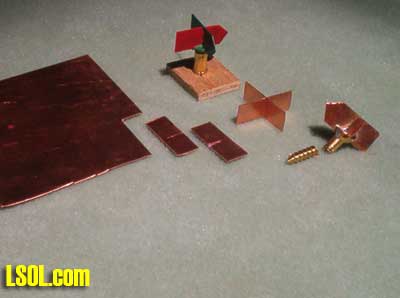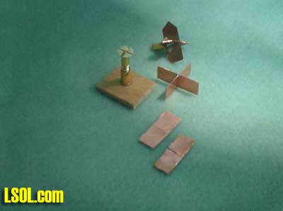 It's a fact of life: If you have track on a railroad, there is going to be a switch located somewhere. On most railroads the switches are going to have the switch throw, which will have a pivoting rod holding a set of blades that are going to be painted contrasting bright colors or have a four-lens lamp (for night time use) or both. These are used by railroad personnel to confirm the position of the switch, if it is in a "straight through" position (usually green is the indicator color) or "thrown" to lead into a secondary track or siding, of which the color would likely be red. Our project for this "How to" article, is going to be making a target indicator, which will have two blades, mounted on a brass post, that will slip into the hole that holds the lantern provided in the Aristo manual right and left hand switches. Other manufacturers of switches do not have this provision. This hole or recess in the top of the switch stand has a Philips screw recessed into it, and as you will see, will not be altered. What we are going to do is make our replacement for the dummy hard to see lantern provided, out of two pieces of copper and one brass wood screw with all three pieces sweat-soldered together in one unit. Simple? You bet! 01 - This is one of many shapes of the target indicator blades. Notice that the shaft at the top is shaped in a rectangle to accommodate a lantern that would have a corresponding slot in the bottom of it. The colors on this antique could indicate its use as a derail signal not a switch. 02 - Here are two of the target switch indicators that we are going to make, in use on the D.B.& H. Rwy. Notice the colors match the position of the switches. 03 - A collection of the parts and tools needed, but just tin snips and a hobby saw, a ruler, and solder are the very basic tools. For your materials, sheet copper (from Michael's Craft Stores in the mid-Atlantic region) some brass woodscrews, flat-headed, # 10 size by 1 inch long. A number 8 or 12 size screw will be either too large or too small for our use. 04 - Place your brass flat head screw in your vise, and cut through the center of the top with a hacksaw/thick-bladed hobby saw, giving you an "X" shaped notch into the screw head. 05 - A view of the completed screw after cutting. Also shown are the basic parts in the three steps. 06 - At this point, cut off the screw threads at the end of the smooth shank. 07 - Here are the materials used, and shown in each stage of construction. At the left is the copper sheet. On the sheet, mark off in pencil or scribe the dimensions of the target blades which are: 1 inch long x 3/8" wide. Mark in the middle of the 1" wide section, the center line which will be your guide to cut halfway through the two pieces. These two pieces will slide into each other, and may need a slightly wider cut than the snips or the saw has produced. With the two copper pieces notched and fitted together to form an "X", place them into the corresponding notches on top of the brass screw. The brass screw should be gripped by a metal vice or a set of vice-grip pliers at the base, and heat applied from either propane or butane torch to allow the solder to flow into the slots and also sweat the blades together where they join. After cooling, straighten as needed, and a point could be cut into two of the ends (see pictures).. A notch could be added to the opposite ends, if desired to enhance the arrow indication. 08 - The finished and unpainted targets are shown on an Aristo-Craft #11205 right hand switch. The target when completed by painting, will be fastened into the hole/receptacle with a drop of "Goop" or glue of that type, to allow the removal of the target without damage to either the switch or the target. You will find that the # 10 size is a tad loose, and as it must pivot to work, thence is the reason for the glue. Different shaped blades were used by different railroads. Round, Round-cornered, reflector lenses attached to the blades, or with a lamp on the top for night-time operations was all common. (You could notch the bottom of the Aristo-supplied lamp and fasten it to the top of the target) I spray painted the entire target a bright green enamel and then hand-painted the opposing blades bright red. My size selection is based on keeping within a large scale size, but large enough to see from a distance.