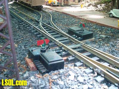 | I have two LGB switches and with your propmpting, I took one apart to study the workings. I did come up with a possible answer, that would indicate the switch position. If you're interested and love to tinker, I'll make a drawing of the mechanical hookup....are you aquainted with a "Harp Throw" switchstand ?....I can make a picture of the drawing so maybe you'll be able to come up with the parts to make what you need. (this is an indicator that will swing to the right or left, and not pivot)Send me your home e-mail address and I'll send the drawing and pictures to you, along with my suggestions. No, it won't alter the LGB switch except maybe a couple small screws in the cover plate. |