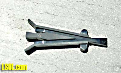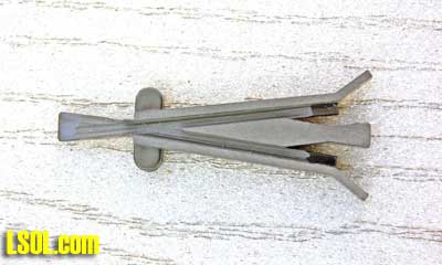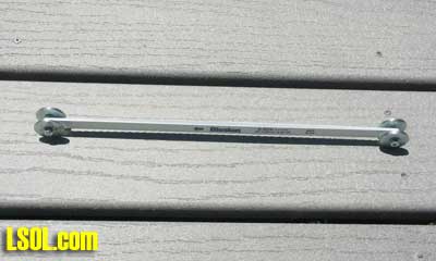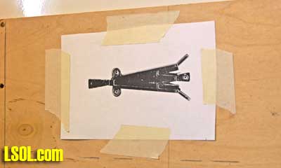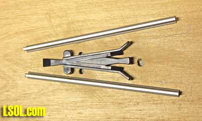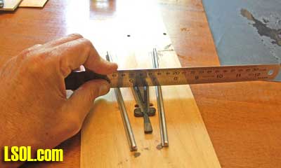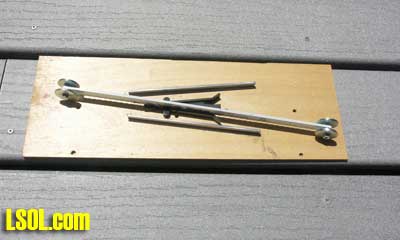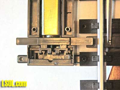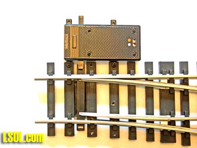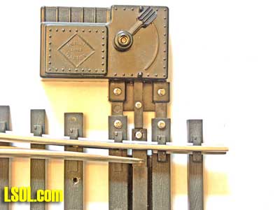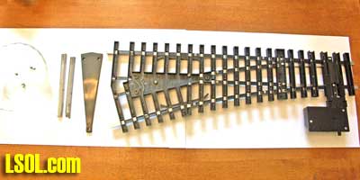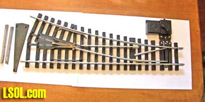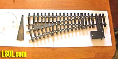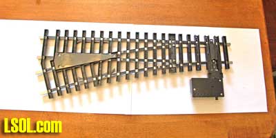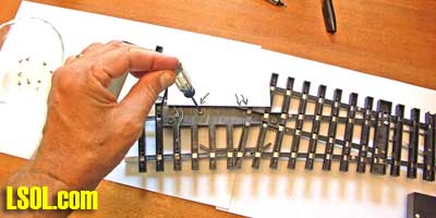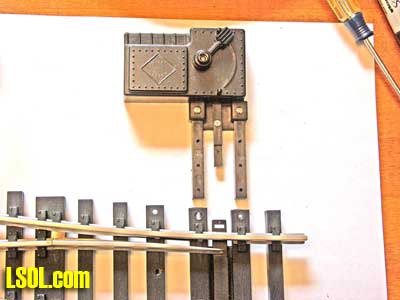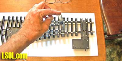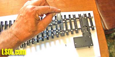 Out of the box my Aristo Craft Wide Radius stainless steel turnouts were troublesome, so I developed some low-tech fixes. I also chose to use LGB electric switch motors and made a record of my findings during the process. Hopefully these notes will be of use when you are installing these or similar products. My outdoor layout incorporates Aristo Craft (AC) SS track and a dozen AC SS Wide Radius (10 foot diameter) Turnouts (products ART20370 Right and ART20380 Left). The turnouts are recent (2005) production, but exhibit problems which I would have thought had been cured years ago. A search of the WWW and forums told me that there is no up-to-date information on modifications to these turnouts, so I will tell you my approach to beating them into submission. I have no experience with the Brass USA-style versions of these turnouts (ART30370 Right and ART30380 Left) but it is possible these notes are applicable to them. While I was doing the mods I decided to replace the manual switch machines with LGB 12010 electric switch machines, AKA "EPL Switch Drive". It seems that development of the AC 11298 'Waterproof Switch Machine' was halted. The LGB machine is NOT entirely compatible with the large radius turnouts, but it can be made to work. Again, no up-to-date information on this subject is available on the WWW, so I will explain what I know. THE PROBLEM: The frog in the turnouts sticks up above the rails. It has to be milled to be even with them. When this is done the grooves are too shallow, letting the flanges rest on the bottom of the grooves, obviating the milling of the frog. When I ran the first trains on the layout, NOTHING went through any of the turnouts well, and I hadn't even tried switching them from the main lines. I had derailments and damage on an LGB Mikado, an AC Streamliner and an Eggliner. Some equipment stalled on the turnouts at low speed since wheels were being raised above the rails. Even the forgiving trains made a racket when traversing the turnouts, and wobbled side-to-side. I located a paper on similar problems with small-radius AC turnouts of 1999 vintage, and this was useful background information. It included some notes on the wide-radius turnouts which were new then, and their teething problems. No mention was made of the badly-formed frog, in relation to the wide-radius turnouts, though. On the smaller turnouts that author milled the tops of the frogs, in place, with an end mill. I don't even know anyone who knows anyone who has an end mill, so I needed a low tech solution. I also developed a technique for milling the bottom of the grooves which is similarly low-tech. Both processes require some elbow grease and the construction of simple jigs, but they work, and are safe and neat. After you have done one, count on 50-70 minutes to repair the frog and install an LGB switch motor, depending on whether everything goes well (that is, whether you lose any parts in the carpet). Disassemble the turnout: You must remove the frogs to work on them. Follow these photos to disassemble the parts of the turnouts necessary to remove the frogs. You will need a #0 Phillips screwdriver, a dish for parts and a dining table. You will remove 4 kinds of screws. I will tell you which ones go where so you don't have to pay much attention to this. Turn the turnout upside down. See the photo below. Remove the triangular cover. It is secured with 3 MEDIUM-length screws. See the photo below. Remove two short fixed rails. These are secured with 1 each MEDIUM screws which go through wires. Note that these screws came from plain holes and not the nearby post-type holes used by the cover. See the photo below. In order to remove the frog you will have to push aside one of the two rails that are tight against it. But in order to remove this rail you will first have to loosen one of the moveable points, and slide the fixed rail away from the frog. The moveable points are secured by the only LONG screw in this process. There is a microscopic spring around this screw, and a hollow brass post through which the screw runs. This post may or may not come loose during this operation. In the photo below I am loosening the screw which secures the moveable point closest to the switch motor. The fixed rail is secured by the only SHORT screw removed during this process. See the photo below. Remove the 3 SELF-TAPPING screws (photo below) that secure the frog (this was the fourth type of screw you encountered). In the photo below, the fixed rail is loosened, screws are removed from the frog and the frog is ready to be slipped out. Now wiggle the frog loose. You will note that it is symmetrical and thus fits both left- and right-hand turnouts. More important to us, frogs from both types of turnouts will fit on the jig you are going to make right now. Note that the frog has 3 posts underneath. You are going to precisely drill three 11/64" holes into a piece of flat wood, snap the frog into the wood and attach two pieces of rail of the same type you are using (brass or SS) alongside the frog. To mark the positions for the 3 holes I suggest inking the frog's posts with marking pen and then quickly pressing it against the wood. Alternatively you can xerox the frog (see photo below) and lay the copy on the wood to locate the holes. These holes must be precise so if you mess up the drilling, just move to another position on the board and try again. Next install the 2 rails onto the jig. If you happen to have scraps of rail with 2 holes in the bottom, use these. Or if you have the means to tap 2 holes, do that. However, a single screw is adequate to secure the rails to the wood base. Of course the wood needs to be pretty thin to utilize the original Aristo Craft screws. You must countersink these holes to avoid scarring your dining table. While drilling the countersink holes consider inserting little washers to allow for better grip. The photo below shows a frog installed on the completed jig, waiting to be milled.