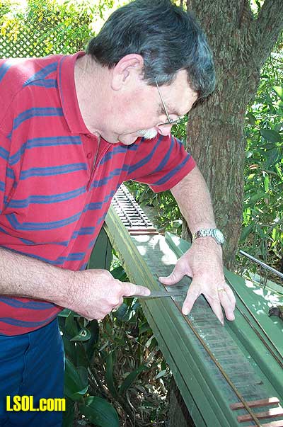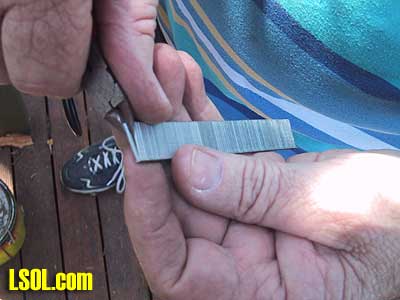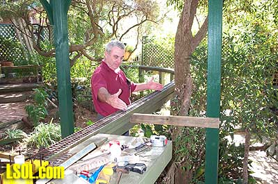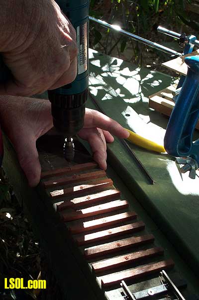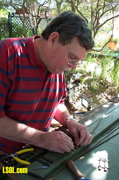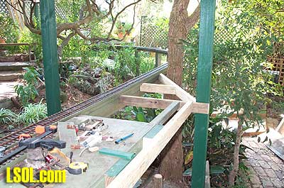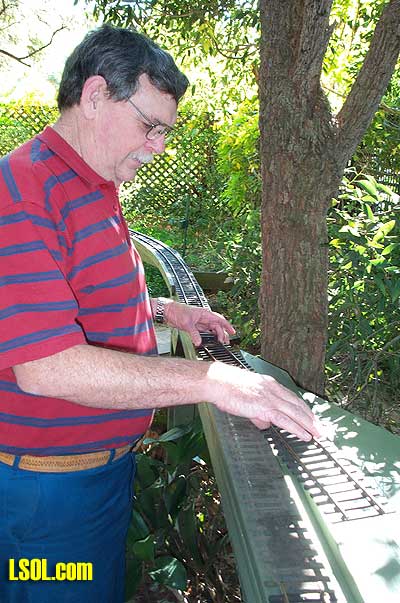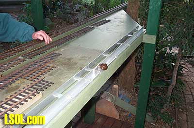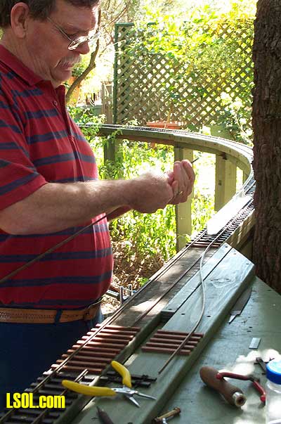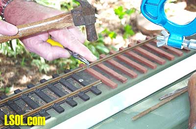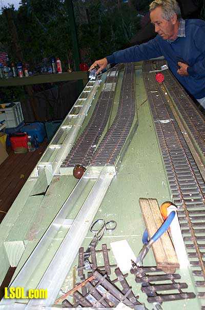 One of the biggest problems that you are likely to face as a railway modeller is when the extension bug hits you and you start looking at where to put all of that extra track. Now comes the tricky part in where the turnouts are going to get off the mainline. Invariably you will not be able to get a set of commercial turnouts to fit without having a dogleg or a kink in the nice flowing curve or the radius coming off not the right size. Faced with this problem many times over my modelling career from N gauge to HO to On30, I simply built them to suit the situation. If I can do it, anyone can, so give it a go. We (the DOGS - see Dunwerken in The Library archives.) had almost finished work on Dunwerken when someone came up with the idea of changing one of the sidings into a passing loop with the addition of a set of turnouts on the mainline. We were able to kill two birds with the one stone (Aussie saying) here because we were in the process of building a sector plate for loading live steam locomotives onto the layout so we just extended the bench work to take both projects. Step 1: After working out where the turnout is going, remove that section of track. In this case we are using Peco flex-track in two foot long pieces so I was able to remove one complete piece. If you are unable to do this simply cut out the size of the turnout plus three inches to allow for the blade mechanism with either a hacksaw or a Dremel or motor-tool. Remove the plastic ties and put the rail aside. Step 2: If need be draw the turnout on the baseboard as a guide especially for the first few times. This then allows you to work out where the ties are to go especially the longer ones in the centre of it. The sleepers (sorry, ties.) in this case were cut out of Australian hardwood on a circular saw bench and then each one was cut to length as required. The ties on the trailing side of the turnout were laid first by simply spacing out roughly in place (ours is a very rustic railway and spacing isn't a big consideration.) and then a small hole was drilled in the centre to prevent splitting and were then fixed into place with a nail used in a nail gun (15mm long.) as these are made from galvanised wire. Fix a few ties on the blade end of the turnout as well to support the rail. Step 3: Work out from your drawing or by looking at another turnout where you have to file the base of the rail away to allow for the blades. I was not in a position to have the use of a vice so I had to do the removal of this metal by perseverance and by taking my time. You can also use a motor-tool if you have one handy but remember that it is very difficult to replace it if you take too much out. Carry out this operation on both rails and get ready to fix them into position. You will have noticed that at no time have we had to use gauges up to now. Step 4: Place the through rail in place and fix into position with rail joiners. Clamp a straight edge along the straight section of rail and mark the inside of the ties. Cut some more of the nails ready to fix the rail. You will no doubt have noticed that these nails have a very nice T head and they are perfect for fixing rail and very cheap as well. Using the power or battery drill, drill a row of holes on the marks on the ties and then hammer the nails in part way. Place rail in position and mark position for holes on the other side. Drill these and then repeat the nailing process. Now you can hammer them home using a nail punch. Place the second rail in position and carefully bend it to the correct radius to suit your application and then repeat the marking and drilling and fixing with the nails. Next part is fitting the blades, frog and wing rails. Top of Page
