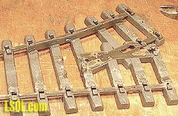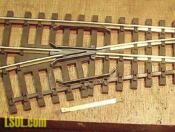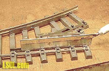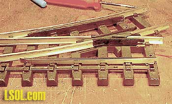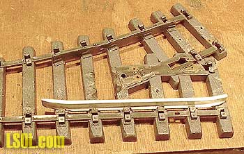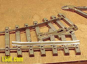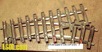 Using a small drill press I drilled the rails and tapped for a 2-56 screw. It just so happens that AC uses that very size for rail joiners. I made the holes in the ties slightly oval for a small bit of adjustment. I did both rails and took it outside and installed a temporary siding. The modification worked well and my Pacific had no problem going thru even at moderate speed, around a scale 30 MPH. The biggest thing I noticed was backing up a string of cars thru the turnout. It kept the wheels away from the frog point and even with 12 cars no problem backing into the siding. This rail can also be painted if desired. I turned my attention to the new extra wide turnouts, as they had the same problem. I removed the rails and tried the bent ends over the guard rail.