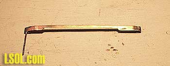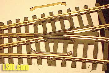 This was put in place on the damaged turnout. Now the wheels went thru much better. I then noticed it just barely cleared the frog point. So I put a small "bow in the piece of brass headed towards the main rail, about center.
