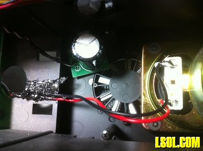I ran the wires up through a hole that I created just above the words "Sound Volume". If you push on that area, you will feel the hole that is already there. I ran an Xacto knife around the hole edge to remove the thin plastic covering.