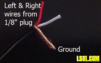 You now need to add a 1/8" stereo plug to the wires. In my electrical box I have extra plugs. The cost of buying a plug is part of the $10 budget. Strip the ends and since we are only using one speaker, you can put the left and right wires together and connect them to the red speaker wire. The ground wire goes to the black speaker wire.